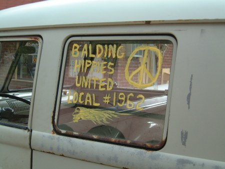 写真左は、トラックの窓にあった「Balding Hippies United(ハゲかかっているヒッピー連合)」のいたずら書き。